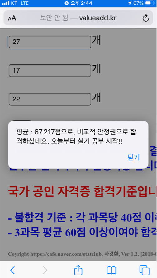 참고로 본인이 합격점수인지 따져보기 번거롭다면, 각 과목별 맞춘 개수를 사경환 블로그에 들어가 입력해보면 결과를 알 수 있다.